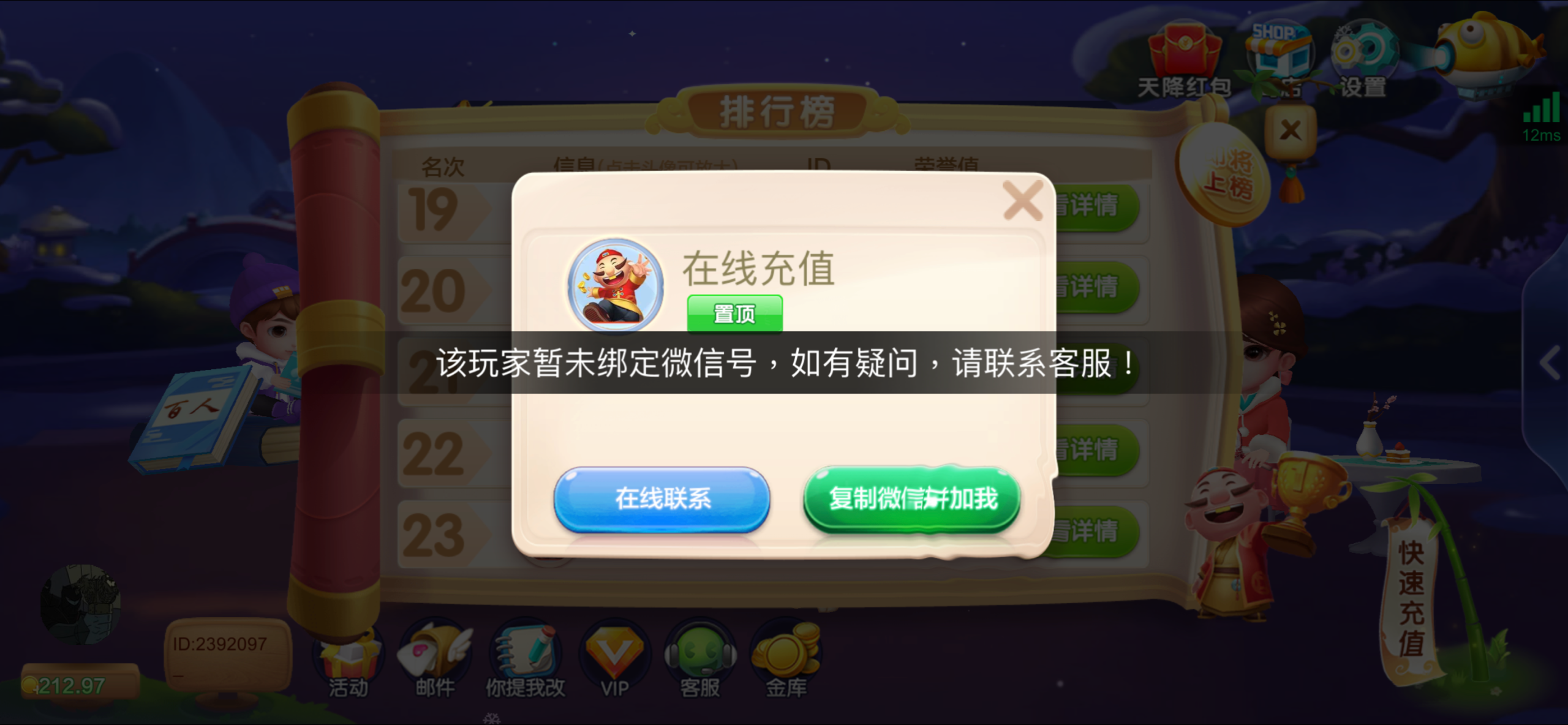 点充值,排行榜榜任意客服打开,别点微信没用直接点在线客服进去
