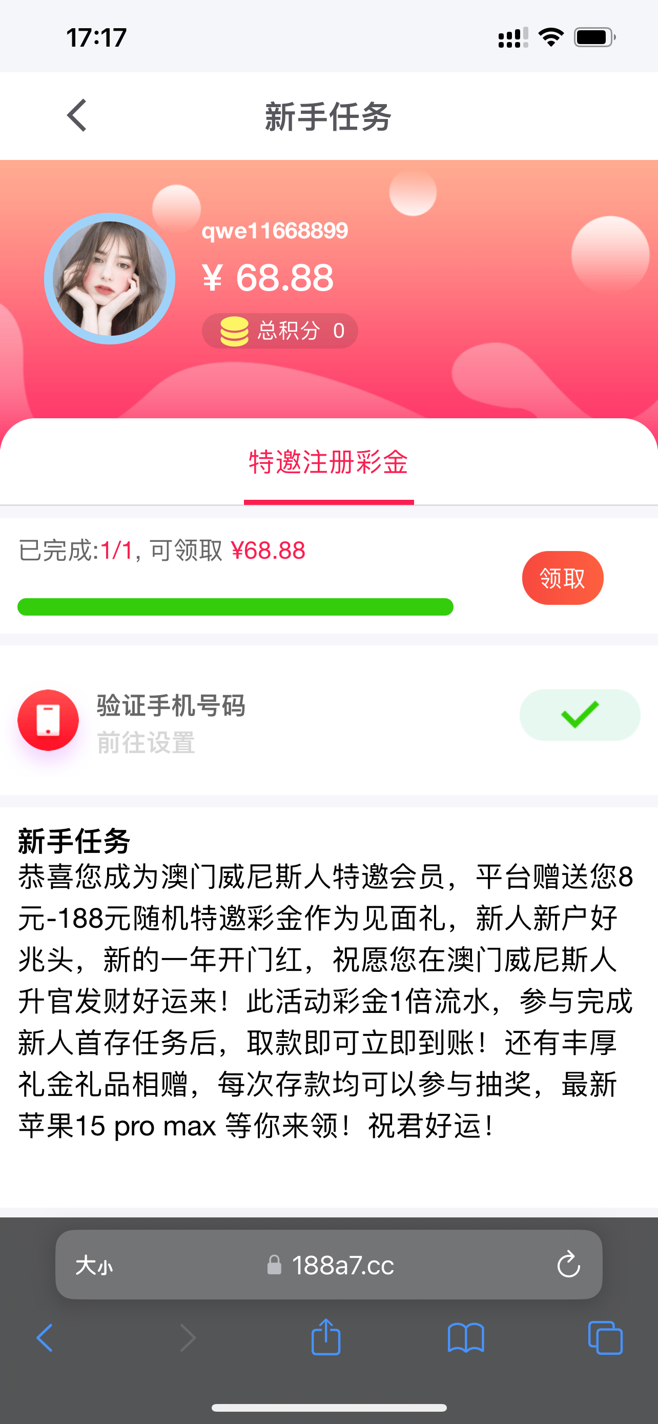 新葡京手机号注册领最高188 我两个手机号都领了68 没打出来 出款情况自测 需不需要特邀自测 没领到别逼逼