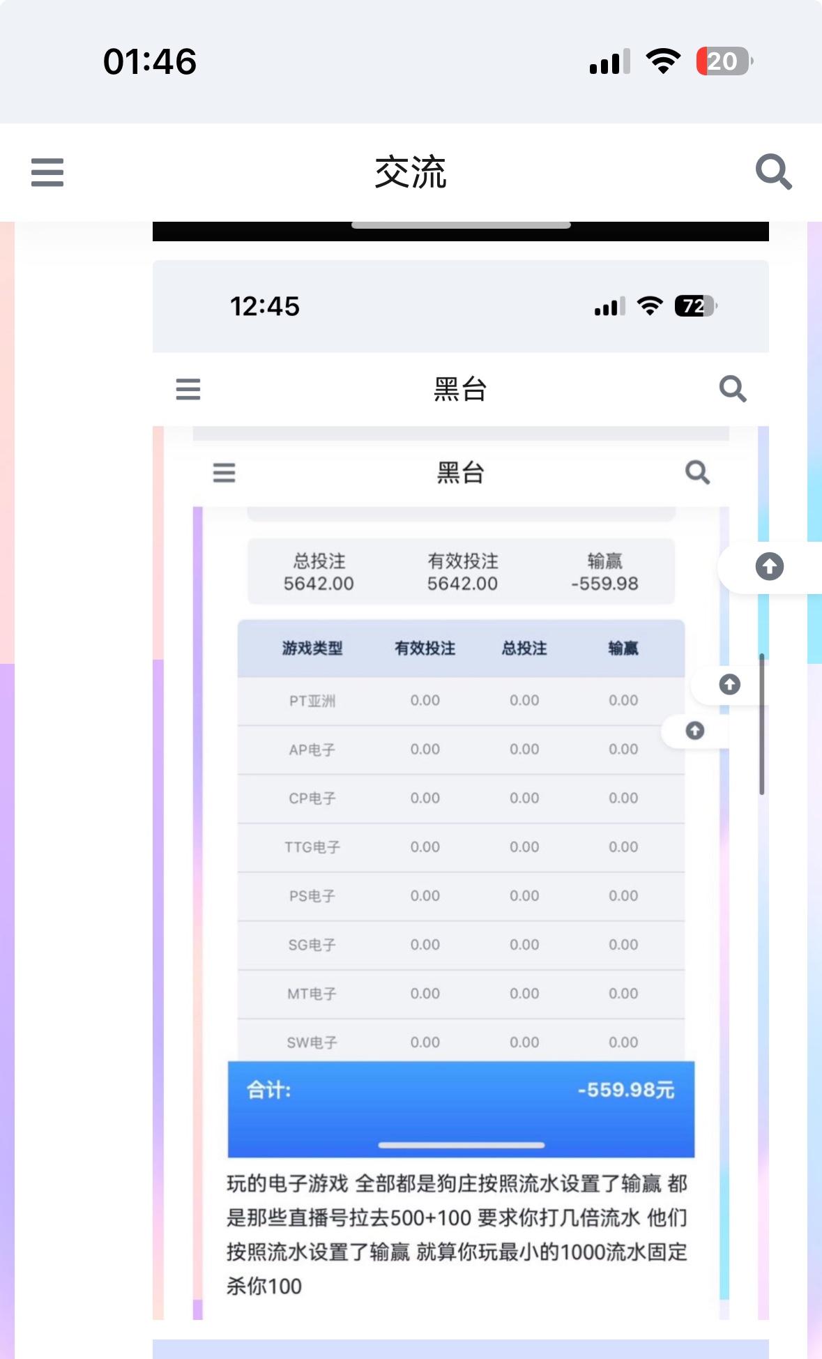 半月没玩还是吃分,今天b66充2000没来一次免费,必赢197充3000,10一拉没过20倍输,pg1,3000玩百家乐,10把没中一把,183直播充500拉胡,3块进胡,得1.6,还好把车贷还啦,踏马的,上个月还车贷差500,充1000连500都没搞得出,有时候偷鸡不成倒蚀一把米,现在的平台新注册都是吃分,想着把把空没有太大的欲望,再见,此字为证,半年内没发黑黑,说明成功戒赌