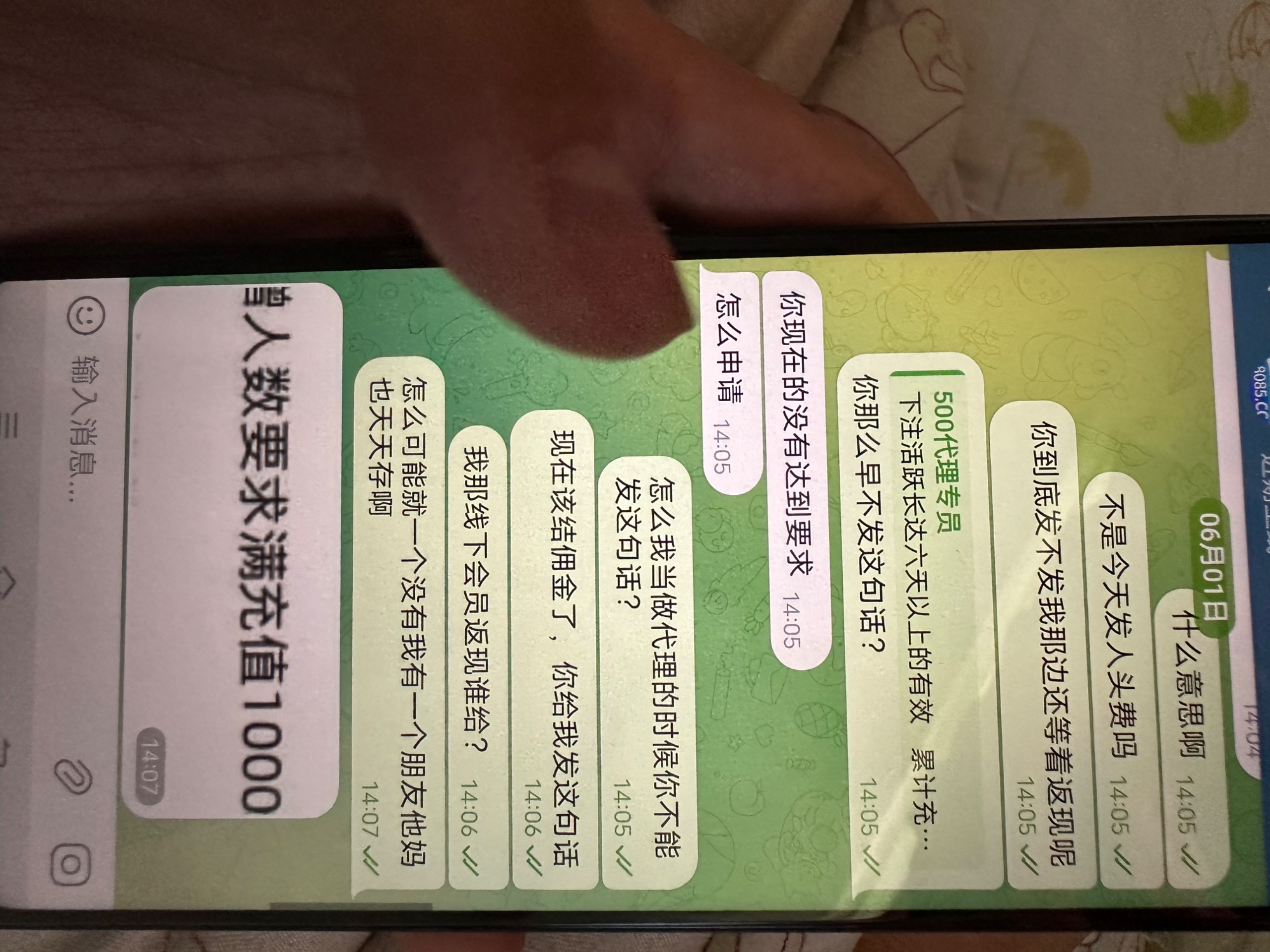 我刚开始推广的时候他就没给我说那个要求,等我该接人头费去了,他跟我说一堆要求说我先下什么各种不符合就我知道的,我一个朋友就帮我天天存,天天存也说我不符合说白了,这种狗逼平台就是没实力,佣金都不给接,还说20号注册的,让我7月1号去妈的,平台上面写着1号金佣金跟个狗揽子似的,广大网友认清500国际黑会员黑佣金黑代理