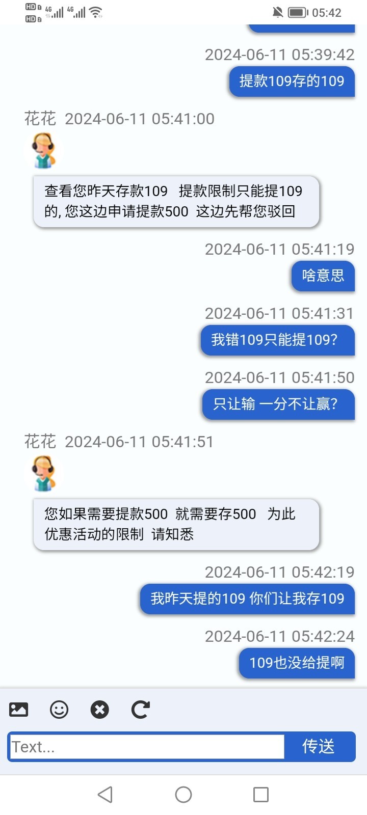打电话送18 提款109 不让提  说让充109才能提  充值以后还是不让提 又让提供手持身份证 提供了也不让提又说只能提银行卡   银行卡最低500提  打到500也不让提  说我存款109只能提109 畜牲  合着我只能输一分不能赢