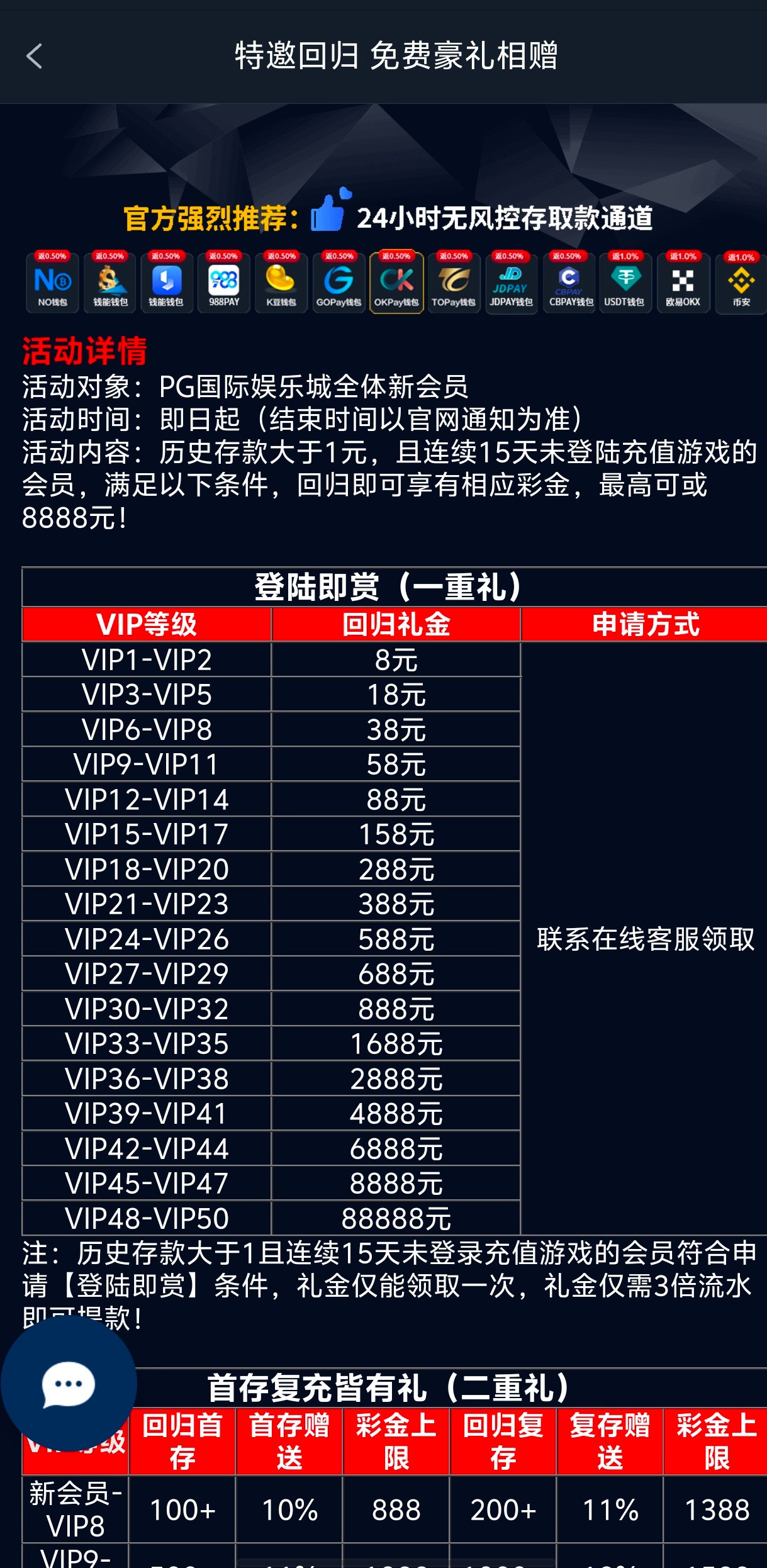 有历史存款玩过的老用户,连续15天以上未登录上线联系客服免费赠送8-88888
