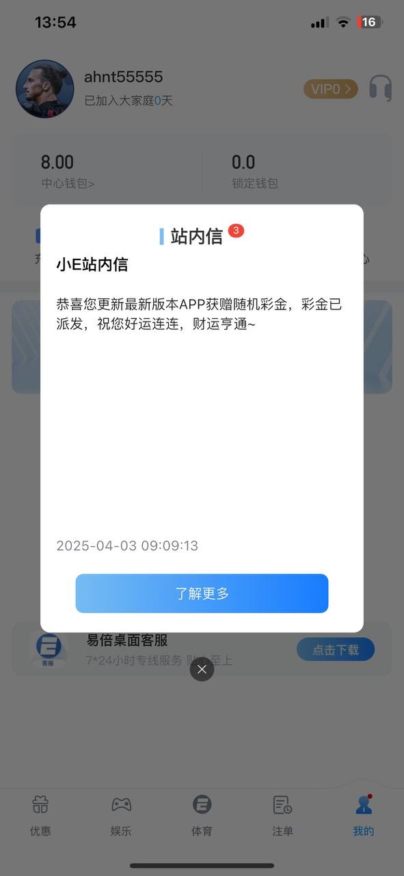 下载APP注册,找客服领取更新APP彩金 客服会让你去站内信申请,有就有了没有无视!