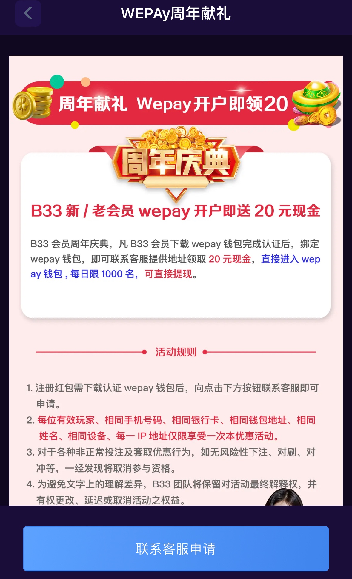 新老用户开户wepay钱包完成实名认证联系客服申请领取20现金每日限1000名,VIP1以上老会员下载APP联系客服领取补偿50次电子免费转