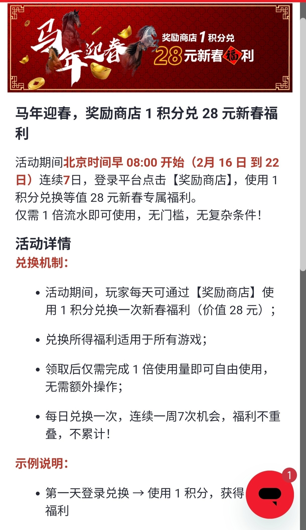 老玩家过年期间送7天28彩金,邮箱是回归彩金10倍流水,积分是换彩金的,1积分换28彩金