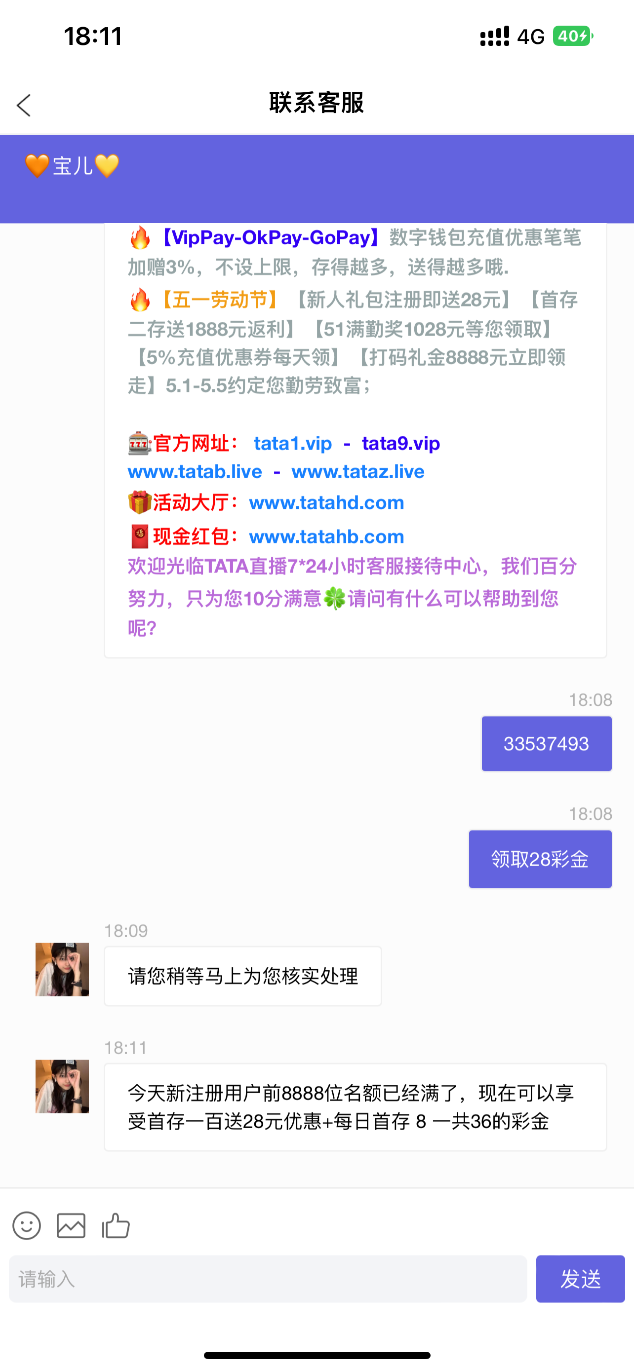 TATA注册说28彩金新人注册绑定银行卡去找客户领取28彩金。今天领不到的,第二天还可以申请一次