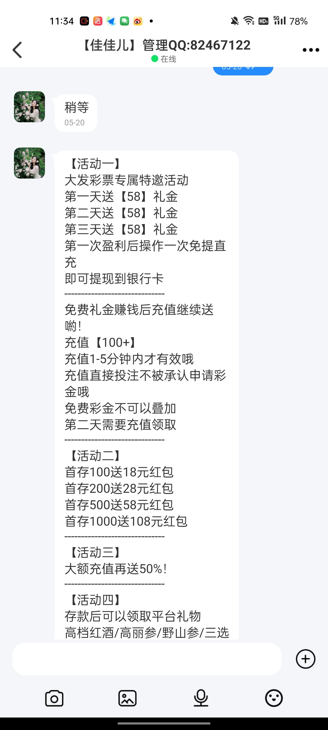 刚来电话送了100后面4天每天送100不用冲钱