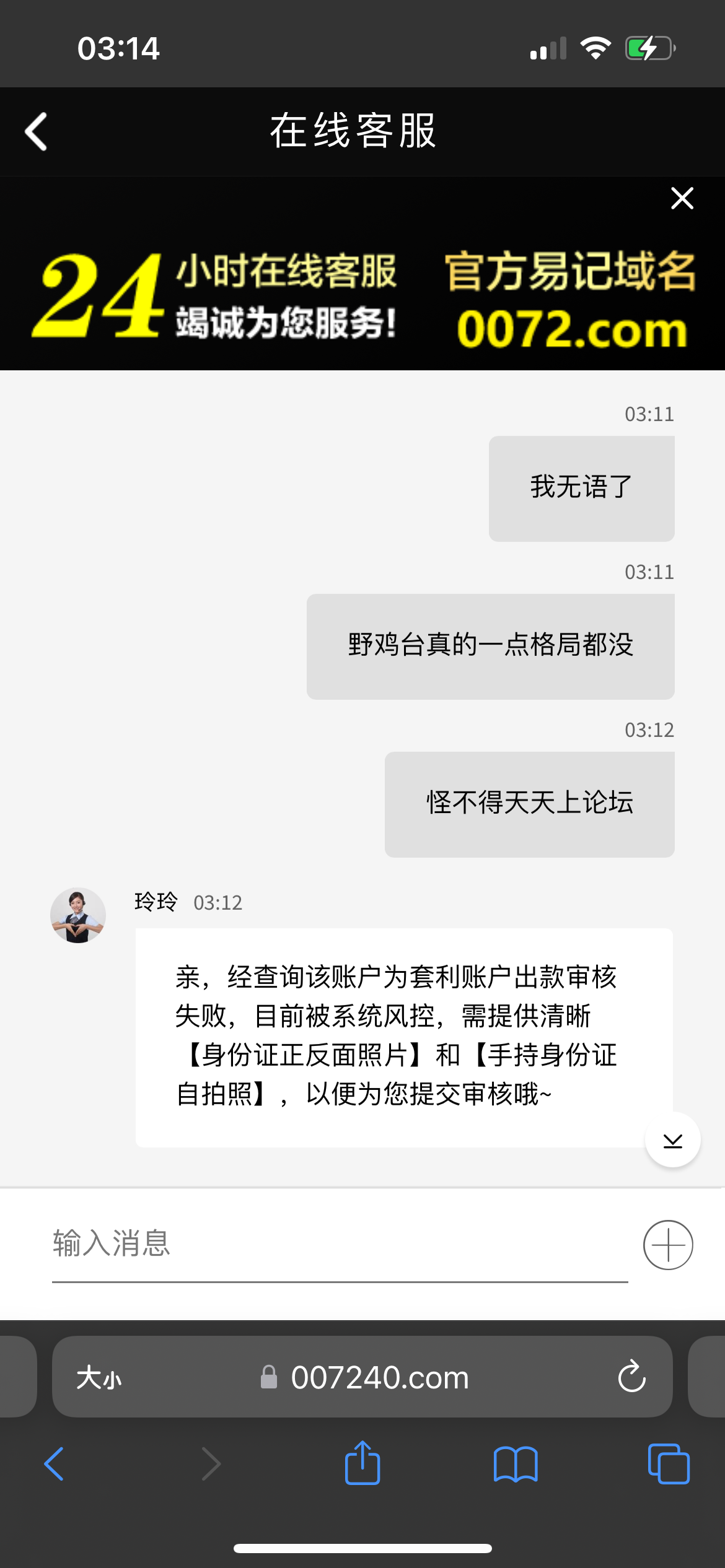 前面一百给我出款然后又充了50打上200想走了直接冻结,还想套我信息,这150就当喂狗好了,各位短信来的野鸡别搞